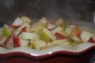 2. Put the pluots in the baking dish. Then, add the apples.